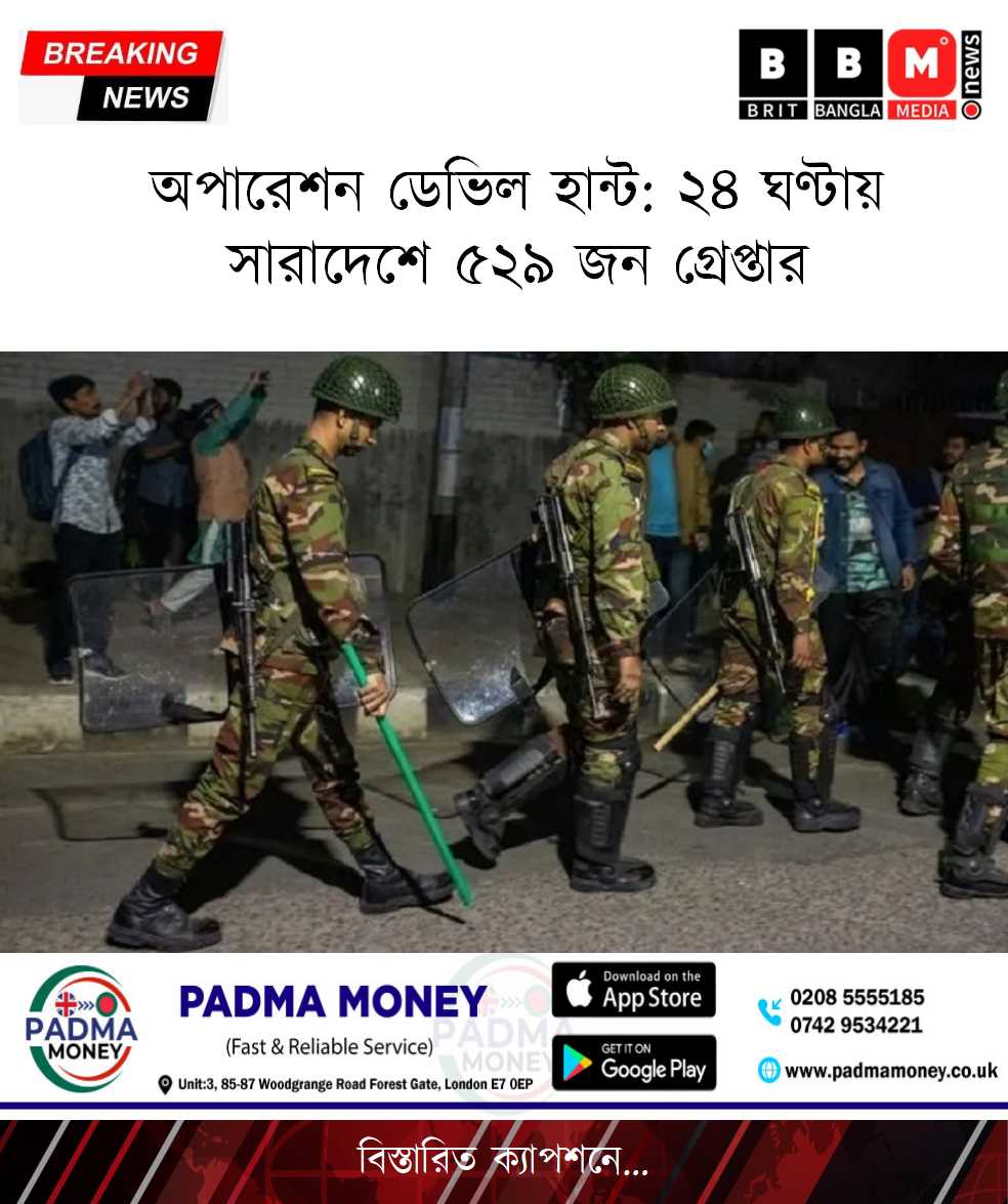সারাদেশে চলমান ‘অপারেশন ডেভিল হান্ট’ অভিযানে গত ২৪ ঘণ্টায় ৫২৯ জনকে গ্রেপ্তার করা হয়েছে। অন্য অভিযানের সঙ্গে মিলিয়ে একই সময়ে মোট ১,৫০৩ জনকে গ্রেপ্তার করা হয়েছে।