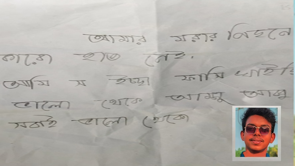 মৃত যুবকের বেডরুমে বালিশের পাশে একটি চিরকুট পাওয়া গেছে, যেখানে লেখা ছিল—“আমার মরার পিছনে কারো হাত নেই, আমি স ইচ্ছায় ফাসি খাইছি, ভালো থেকো আম্মু আব্বু, সবাই ভালো থেকো।”
