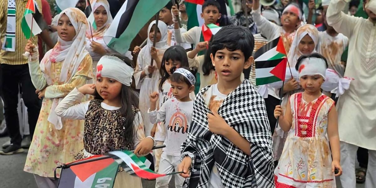 ‘আহত ফিলিস্তিনি’ সাজে মার্চ ফর গাজায় যোগ দিয়েছে শিশুরা