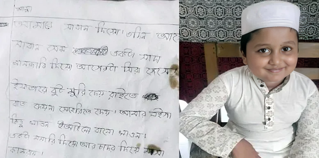 পোস্ট করা ছবিতে দেখা যায়, শিশুটির হাতে লেখা একটি চিঠি। ধারণা করা হচ্ছে, মায়ের হাতে দেওয়া ওই কাগজটিই ছিল তার নিজের লেখা চিঠি। চিঠিতে সে লিখেছে— ‘আম্মা, আমারে সাবান দিয়ো। ৩ দিন আগে সাবান শেষ। একটা সাদা পাঞ্জাবি দিয়ো, আগেরটা ছিড়া গেছে। ইফতারে বুট মুড়ি দেয়। রাতে ভাত দেয় না। আমার জন্য কিছু খাবার আইনো। ভালো খাবার। একটা মশারি দিয়ো। আর চাদর দিয়ো। মশা কামড়ায়।’