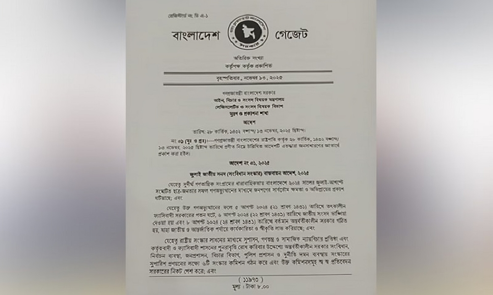 বাংলাদেশের দীর্ঘ রাজনৈতিক অস্থিরতা ও গণআন্দোলনের পরিপ্রেক্ষিতে বৃহস্পতিবার সরকার আনুষ্ঠানিকভাবে ‘জুলাই জাতীয় সনদ (সংবিধান সংস্কার) বাস্তবায়ন আদেশ, ২০২৫’ জারি করেছে। আইন, বিচার ও সংসদ বিষয়ক মন্ত্রণালয়ের লেজিসলেটিভ ও সংসদ বিষয়ক বিভাগ এই আদেশটি জনসাধারণের অবগতির জন্য সরকারি গেজেটে প্রকাশ করেছে।