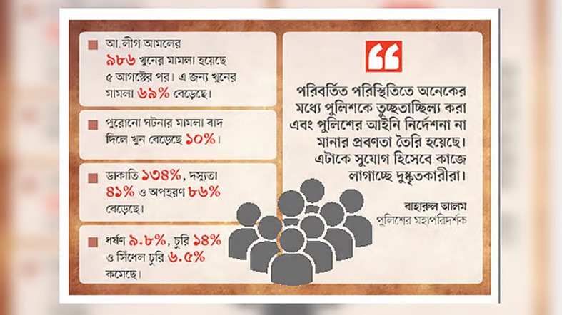 আইনশৃঙ্খলা পরিস্থিতির অবনতি নিয়ে সরকারের বিভিন্ন পর্যায়ে আলোচনা হয়েছে। গোয়েন্দা সংস্থাগুলো অপরাধ বৃদ্ধির কারণ হিসেবে পাঁচটি বিষয় চিহ্নিত করেছে—গণ-অভ্যুত্থানের পর পুলিশের মনোবল দুর্বল হওয়া, আইনশৃঙ্খলা বাহিনীর তৎপরতা কমে যাওয়া, আইনের প্রতি সাধারণ মানুষের সাময়িক অনাস্থা, রাজনৈতিক সহিংসতা ও দখল-চাঁদাবাজির প্রবণতা বৃদ্ধি এবং গণমাধ্যম ও সামাজিক যোগাযোগমাধ্যমে অপরাধের ব্যাপক প্রচার।