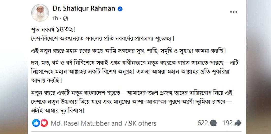 পোস্টে ড. শফিকুর রহমান লিখেন, ‘শুভ নববর্ষ ১৪৩২! দেশ-বিদেশে অবস্থানরত সকলের প্রতি নববর্ষের প্রাণঢালা শুভেচ্ছা। এই নতুন বছরে মহান রবের কাছে আমি সকলের সুখ, শান্তি, সমৃদ্ধি ও সুস্বাস্থ্য কামনা করছি।’