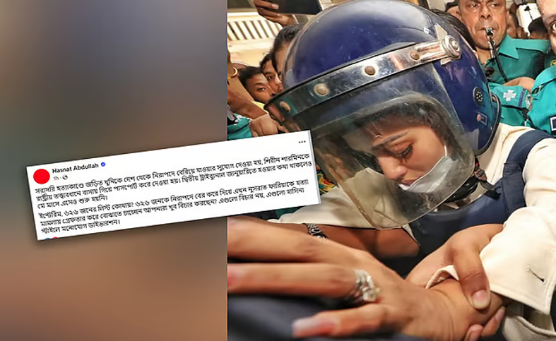 হাসনাত আব্দুল্লাহ তার পোস্টে অভিযোগ করেছেন, “সরাসরি হত্যাকাণ্ডে জড়িত খুনিকে দেশ থেকে নিরাপদে বেরিয়ে যাওয়ার সুযোগ দেওয়া হয়। শিরীন শারমিনকে রাষ্ট্রীয় তত্ত্বাবধানে বাসায় গিয়ে পাসপোর্ট করে দেওয়া হয়। দ্বিতীয় ট্রাইব্যুনাল জানুয়ারিতে হওয়ার কথা থাকলেও মে মাসেও তা শুরু হয়নি।” তিনি আরও প্রশ্ন তোলেন, “৬২৬ জনের ইন্টেরিম লিস্ট কোথায়? এতজনকে নিরাপদে বের করে দিয়ে এখন ফারিয়াকে হত্যা মামলায় গ্রেপ্তার করে বোঝাতে চাইছেন, বিচার হচ্ছে? এটা স্পষ্টতই মনোযোগ সরিয়ে দেওয়ার কৌশল।”