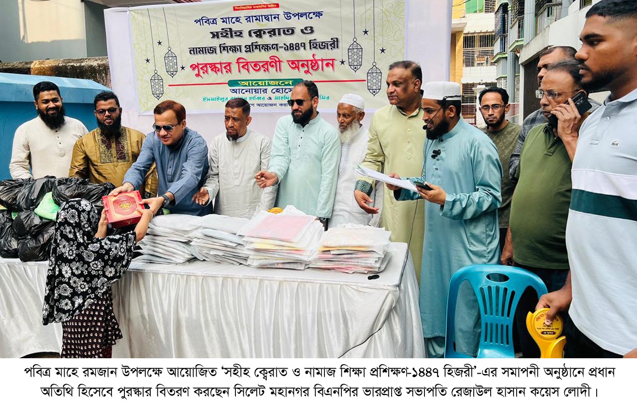 পবিত্র মাহে রমজান উপলক্ষে আয়োজিত ‘সহীহ ক্বেরাত ও নামাজ শিক্ষা প্রশিক্ষণ-১৪৪৭ হিজরী’-এর সমাপনী ও পুরস্কার বিতরণী অনুষ্ঠান নগরীর ৭নং ওয়ার্ডের জালালাবাদ আবাসিক এলাকায় সম্পন্ন হয়েছে। অনুষ্ঠানে প্রধান অতিথির বক্তব্যে সিলেট মহানগর বিএনপির ভারপ্রাপ্ত সভাপতি ও সিসিকের সাবেক প্যানেল মেয়র রেজাউল হাসান কয়েস লোদী বলেন, নৈতিক ও আদর্শিক সমাজ গঠনে পবিত্র কুরআনের শিক্ষার কোনো বিকল্প নেই।
