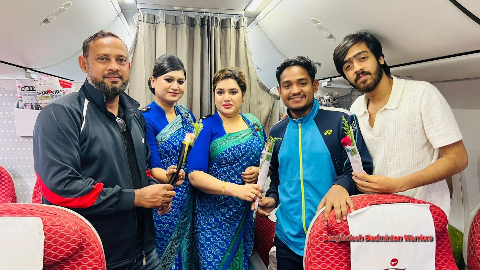 বিমান বাংলাদেশ এয়ারলাইন্সের বিজনেস ক্লাসে তাদের দেশে আনা হয়। বিমানে ওঠার পরপরই জাতীয় পতাকাবাহী এই সংস্থার পক্ষ থেকে ফুল দিয়ে স্বর্ণজয়ীদের শুভেচ্ছা জানানো হয়। পরে কেক কেটে তাদের সংবর্ধনা দেওয়া হয়।
