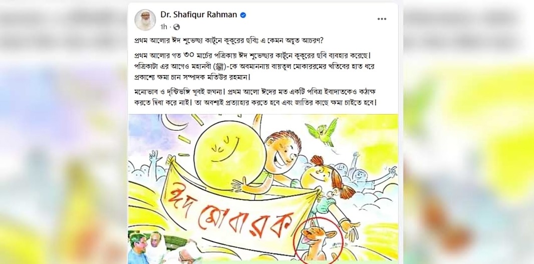 ফেসবুক পোস্টে ডা. শফিকুর রহমান লিখেন, প্রথম আলোর ঈদ শুভেচ্ছা কার্টুনে কুকুরের ছবি, এ কেমন অদ্ভূত আচরণ?