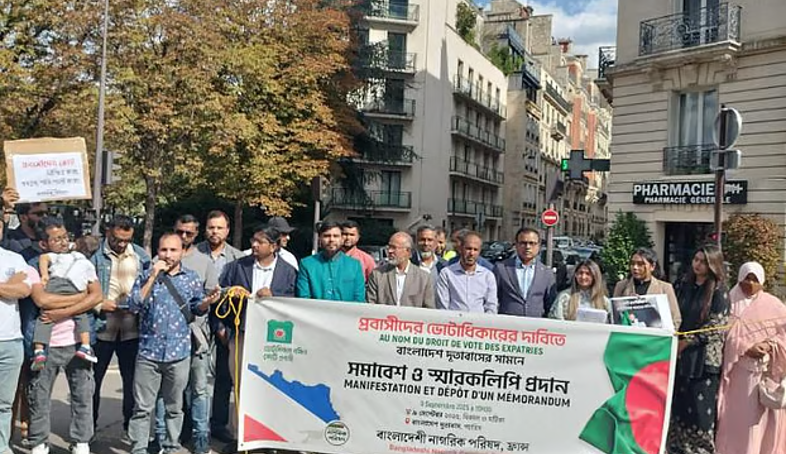 ফ্রান্সে প্রবাসী বাংলাদেশিদের ভোটাধিকার নিশ্চিত করার দাবিতে বাংলাদেশি নাগরিক পরিষদ অধ্যাপক মুহাম্মদ ইউনূসের নেতৃত্বাধীন অন্তর্বর্তী সরকারের কাছে স্মারকলিপি দিয়েছে। গত ৯ সেপ্টেম্বর প্যারিসে বাংলাদেশ দূতাবাসের মাধ্যমে এ স্মারকলিপি প্রদান করা হয়। এর আগে দূতাবাসের সামনে আয়োজিত সমাবেশে বিপুলসংখ্যক প্রবাসী ব্যানার, প্লেকার্ড ও ফেস্টুন হাতে যোগ দেন।