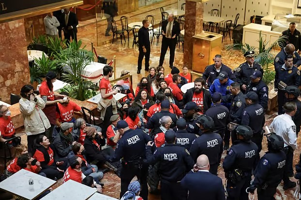 আল-জাজিরার প্রতিবেদনে বলা হয়েছে, বিক্ষোভকারীরা প্রথমে সাধারণ পর্যটকের পোশাকে ট্রাম্প টাওয়ারে প্রবেশ করেন। পরে তাঁরা লাল টি-শার্ট পরে খলিলের মুক্তির দাবিতে স্লোগান দিতে শুরু করেন। পুলিশ দ্রুত অভিযান চালিয়ে তাঁদের মধ্যে ৯৮ জনকে গ্রেপ্তার করে, যাদের বিরুদ্ধে অসদাচরণের অভিযোগ আনা হয়েছে।