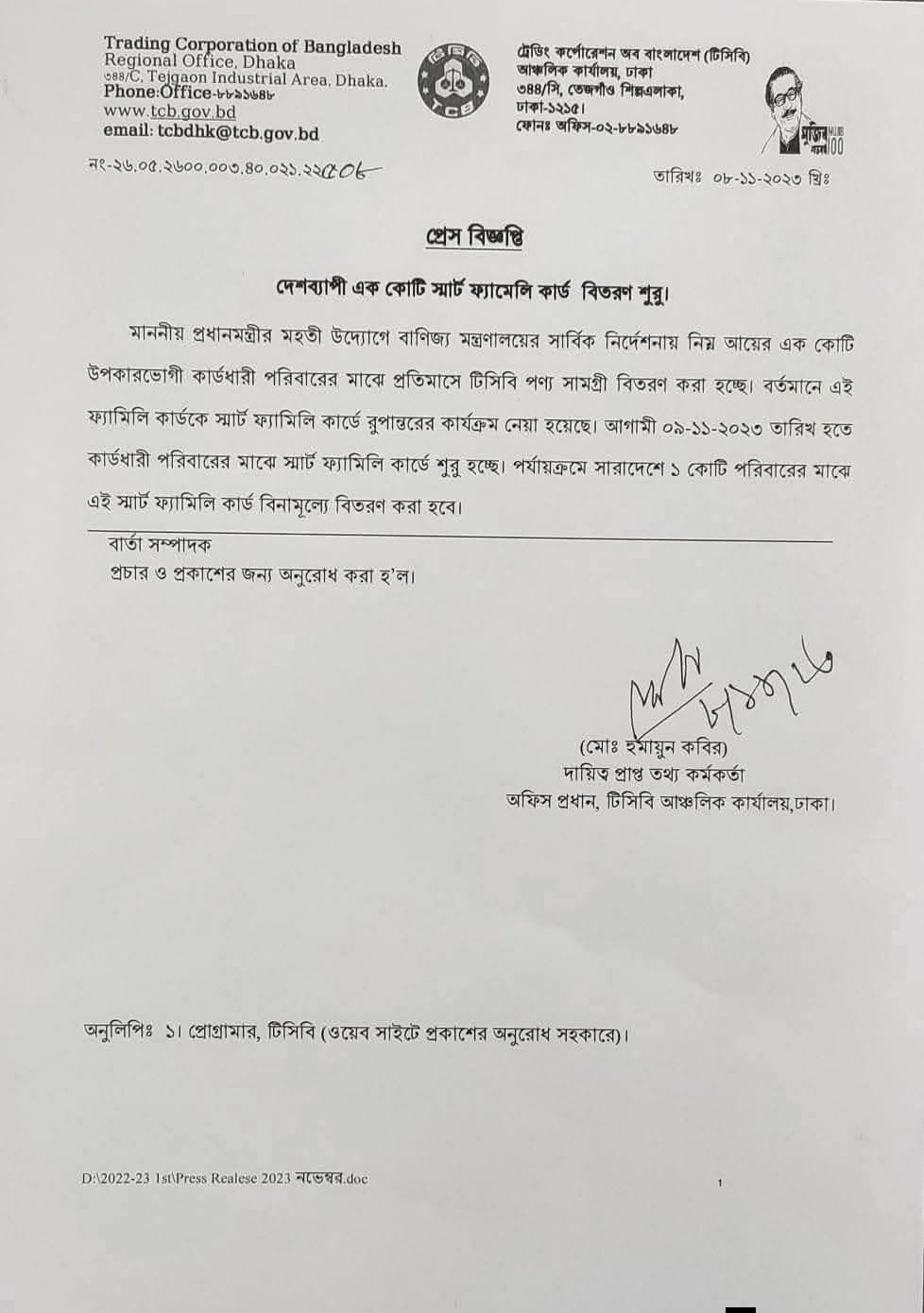ফ্যামিলি কার্ড প্রকল্পকে ঘিরে চলমান রাজনৈতিক বক্তব্যের প্রেক্ষাপটে স্পষ্ট হচ্ছে, এ কর্মসূচির সূচনা কোনো সাম্প্রতিক নির্বাচনী প্রচারণার অংশ নয়। বরং ২০২৩ সালেই তৎকালীন প্রধানমন্ত্রী শেখ হাসিনার নেতৃত্বাধীন সরকার এই প্রকল্পের আনুষ্ঠানিক কার্যক্রম শুরু করে। ট্রেডিং করপোরেশন অব বাংলাদেশ (টিসিবি) প্রকাশিত প্রেস বিজ্ঞপ্তি ও সরকারি নথি অনুযায়ী, বাণিজ্য মন্ত্রণালয়ের সার্বিক নির্দেশনায় এক কোটি উপকারভোগী পরিবারের মাঝে স্মার্ট ফ্যামিলি কার্ড বিতরণের সিদ্ধান্ত নেওয়া হয় এবং তা পর্যায়ক্রমে বাস্তবায়নের উদ্যোগ নেওয়া হয়।