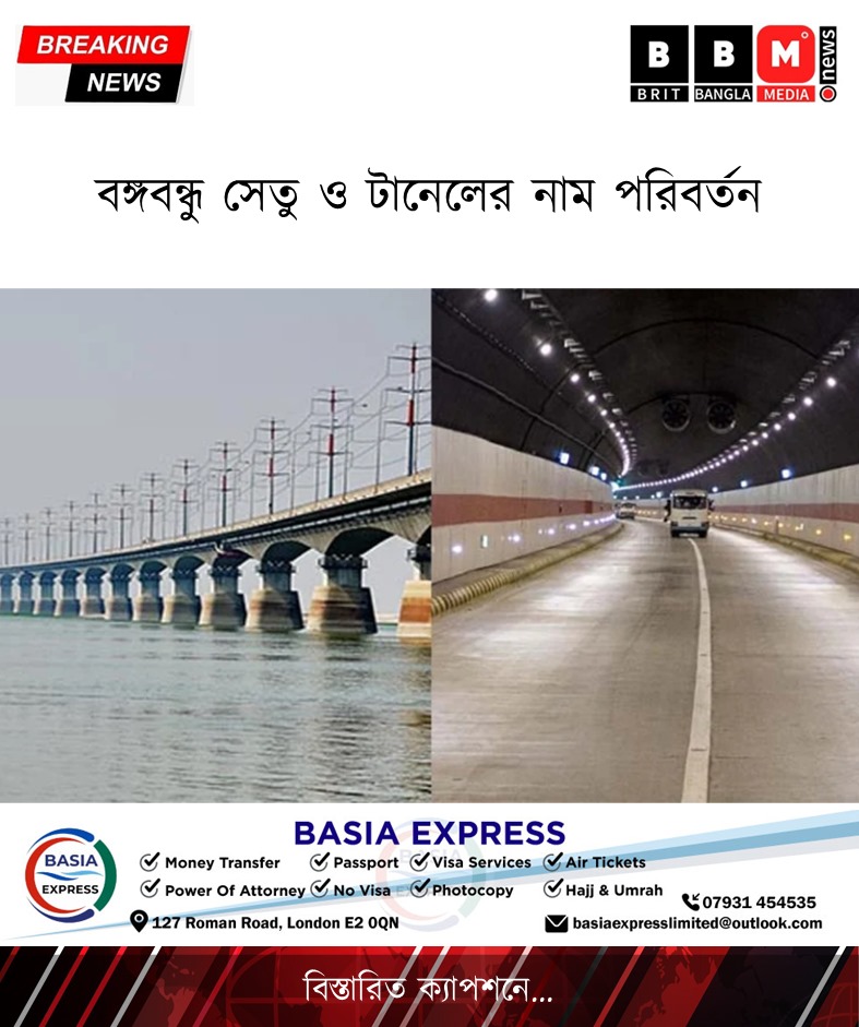 সরকার বঙ্গবন্ধু সেতুর নাম পরিবর্তন করে ‘যমুনা সেতু’ এবং বঙ্গবন্ধু শেখ মুজিবুর রহমান টানেলের নাম ‘কর্ণফুলী টানেল’ করেছে। বুধবার সেতু বিভাগ এ সংক্রান্ত একটি প্রজ্ঞাপন জারি করে, যা তাৎক্ষণিকভাবে কার্যকর হবে।