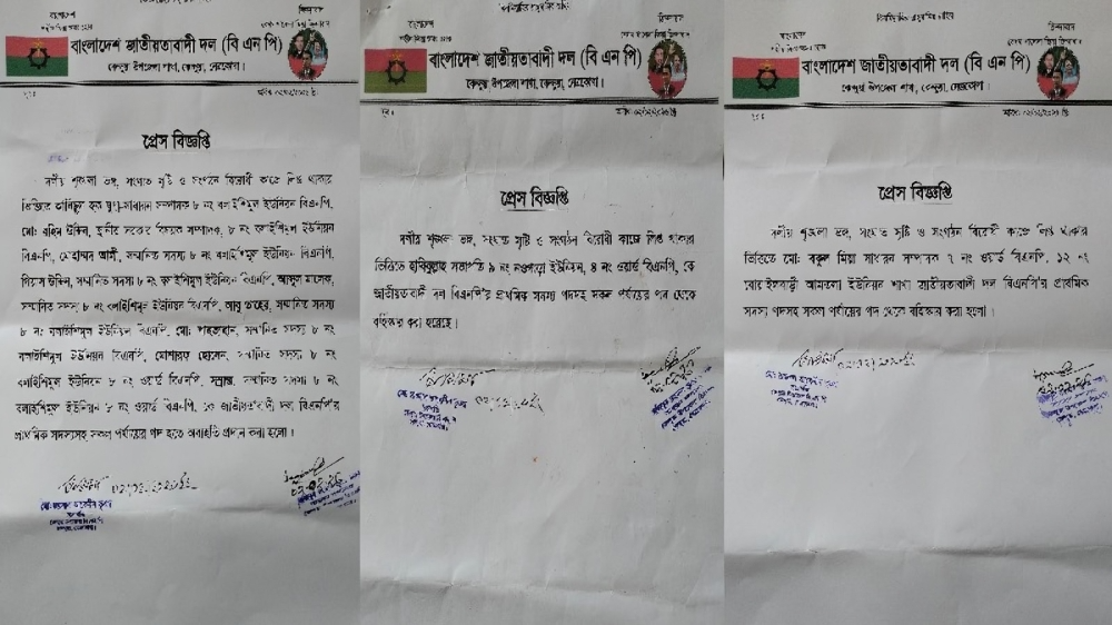 বিজ্ঞপ্তিতে উল্লেখ করা হয়, দলীয় সিদ্ধান্ত অমান্য করে সংগঠনবিরোধী কার্যকলাপে জড়িত থাকার কারণে সংশ্লিষ্ট নেতাদের বিরুদ্ধে সাংগঠনিক ব্যবস্থা নেওয়া হয়েছে। তাদেরকে বিএনপির প্রাথমিক সদস্যপদসহ সব পর্যায়ের পদ থেকে বহিষ্কার করা হয়েছে বলে জানানো হয়।