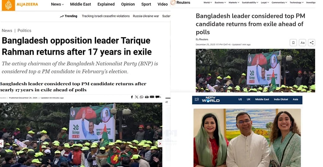 আন্তর্জাতিক বার্তা সংস্থা রয়টার্স তাদের প্রতিবেদনে তারেক রহমানের প্রত্যাবর্তনকে আসন্ন জাতীয় নির্বাচনের প্রেক্ষাপটে বিশ্লেষণ করেছে। প্রতিবেদনে বলা হয়, প্রায় ১৭ বছর বিদেশে অবস্থানের পর তিনি ঢাকায় ফিরেছেন এবং বিএনপি তাকে সম্ভাব্য শীর্ষ প্রধানমন্ত্রী প্রার্থী হিসেবে দেখছে। রয়টার্স উল্লেখ করে, দীর্ঘ নির্বাসনের অবসান দলের নেতাকর্মীদের মধ্যে নতুন উদ্দীপনা সৃষ্টি করতে পারে। পাশাপাশি ঢাকায় লাখো সমর্থকের উপস্থিতি এবং কঠোর নিরাপত্তা ব্যবস্থার বিষয়টিও প্রতিবেদনে গুরুত্ব পায়, যা এই প্রত্যাবর্তনের রাজনৈতিক তাৎপর্যকে আরও স্পষ্ট করে।