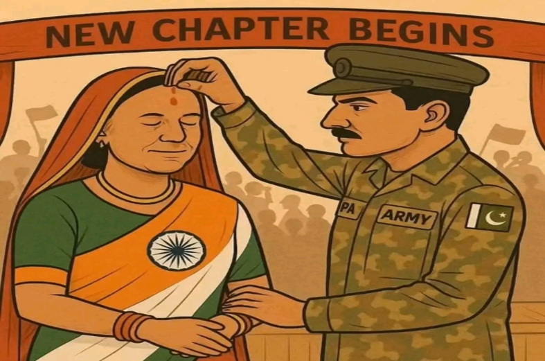 সম্প্রতি ফেসবুকে ব্যাপক ভাইরাল হয়েছে একটি ব্যঙ্গচিত্র, যেখানে দেখা যাচ্ছে পাকিস্তান সেনাবাহিনীর একজন সদস্য সিঁদুর পরাচ্ছেন ভারতের জাতীয় পতাকার রঙে শাড়ি পরিহিত এক নারীর কপালে। ব্যাকগ্রাউন্ডে লেখা রয়েছে—“নিউ চ্যাপ্টার বিগিনস”। ছবিটি ঘিরে দুই দেশের সামাজিক যোগাযোগ মাধ্যমে চলছে উত্তপ্ত আলোচনা ও বিতর্ক।