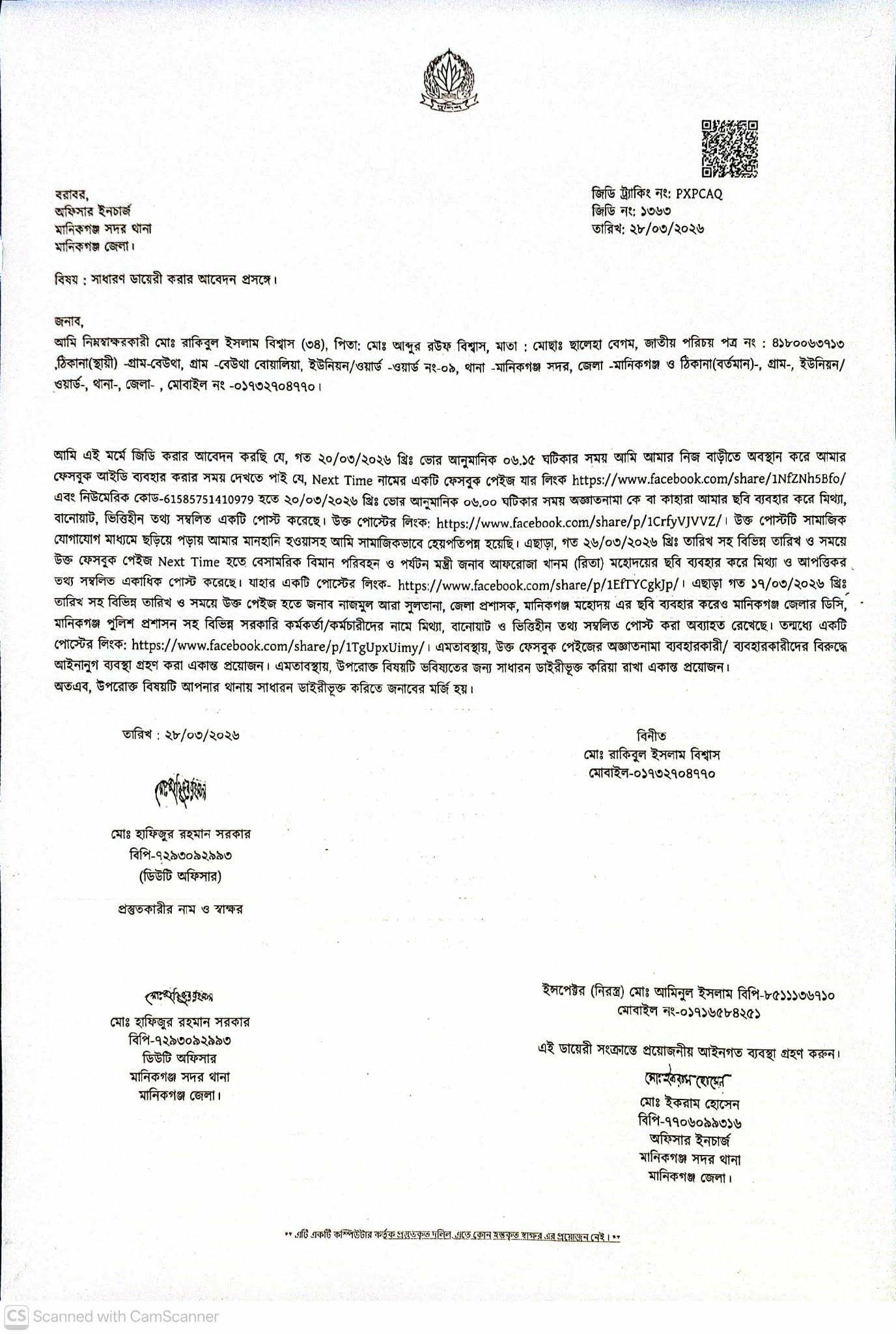 অভিযোগ সূত্রে জানা গেছে, মানিকগঞ্জ সদর উপজেলার মো. রাকিবুল ইসলাম বিশ্বাস নামের এক ব্যক্তি এ বিষয়ে থানায় সাধারণ ডায়েরি (জিডি) করার আবেদন করেন। তিনি অভিযোগ করেন, গত ২০ মার্চ ২০২৬ তারিখে তার ব্যক্তিগত ফেসবুক ব্যবহারের সময় ‘নেক্সট টাইম’ নামের একটি পেজ থেকে প্রধানমন্ত্রীর ঈদ কার্ড সংক্রান্ত বিকৃত ও মিথ্যা তথ্যসহ একটি পোস্ট প্রকাশ করা হয়।