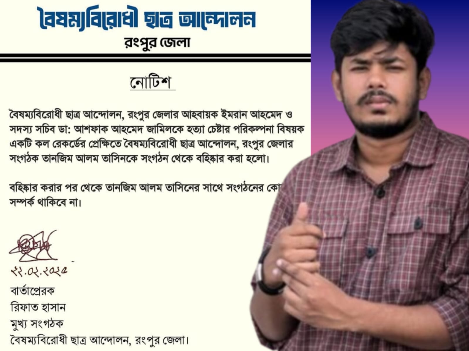 এর আগে, রংপুর জেলা কমিটির মুখ্য সংগঠক রিফাত হাসান স্বাক্ষরিত একটি নোটিশে বহিষ্কারের বিষয়টি জানানো হয় । এতে বলা হয়েছে, ‘বৈষম্যবিরোধী ছাত্র আন্দোলন রংপুর জেলার আহ্বায়ক ইমরান আহমেদ ও সদস্য সচিব ডা. আশফাক আহমেদ জামিলকে হত্যাচেষ্টার পরিকল্পনা বিষয়ক একটি কল রেকর্ডের প্রেক্ষিতে জেলার সংগঠক তানজিম আলম তাসিনকে সংগঠন থেকে বহিষ্কার করা হলো । বহিষ্কার করার পর থেকে তানজিম আলম তাসিনের সঙ্গে সংগঠনের কোনো সম্পর্ক থাকবে না ।’