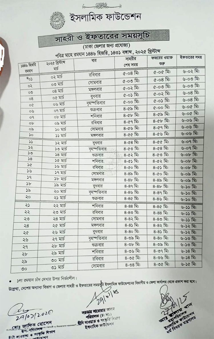 সময়সূচি অনুযায়ী, ২ মার্চ (রোববার) প্রথম রমজানে ঢাকায় সেহরির শেষ সময় ভোররাত ৫টা ৪ মিনিট এবং ইফতারির সময় ৬টা ২ মিনিট। তবে, দেশের অন্যান্য অঞ্চলের সেহরি ও ইফতারির সময় ঢাকার সময়ের সঙ্গে সর্বোচ্চ ৯ মিনিট পর্যন্ত বাড়ানো বা কমানো হতে পারে, যা নির্ভর করবে স্থানীয় দূরত্বের উপর।