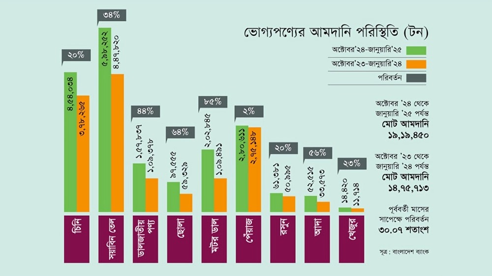বাংলাদেশ ব্যাংকের ঋণপত্র (এলসি) নিষ্পত্তির তথ্য অনুযায়ী, ২০২৩-২৪ অর্থবছরের একই সময়ে ভোগ্যপণ্যের মোট আমদানি ছিল ১৪ লাখ ৭৫ হাজার ৭১৩ টন, যা এবার বেড়ে ১৯ লাখ ১৯ হাজার ৪৫০ টনে পৌঁছেছে। এর মধ্যে চিনি আমদানি ২০ শতাংশ, সয়াবিন তেল ৩৪ শতাংশ, ডালজাতীয় পণ্য ৪৪ শতাংশ, ছোলা ৬৪ শতাংশ, মটর ডাল ৮৫ শতাংশ, রসুন ২০ শতাংশ, আদা ৫৬ শতাংশ এবং পেঁয়াজ ২ শতাংশ বেড়েছে। খেজুরের আমদানি গত বছরের তুলনায় ২৩ শতাংশ বৃদ্ধি পেয়েছে, যা গত রমজানের তুলনায় বাজারে স্থিতিশীলতা বজায় রাখতে সাহায্য করবে বলে মনে করছেন সংশ্লিষ্টরা।