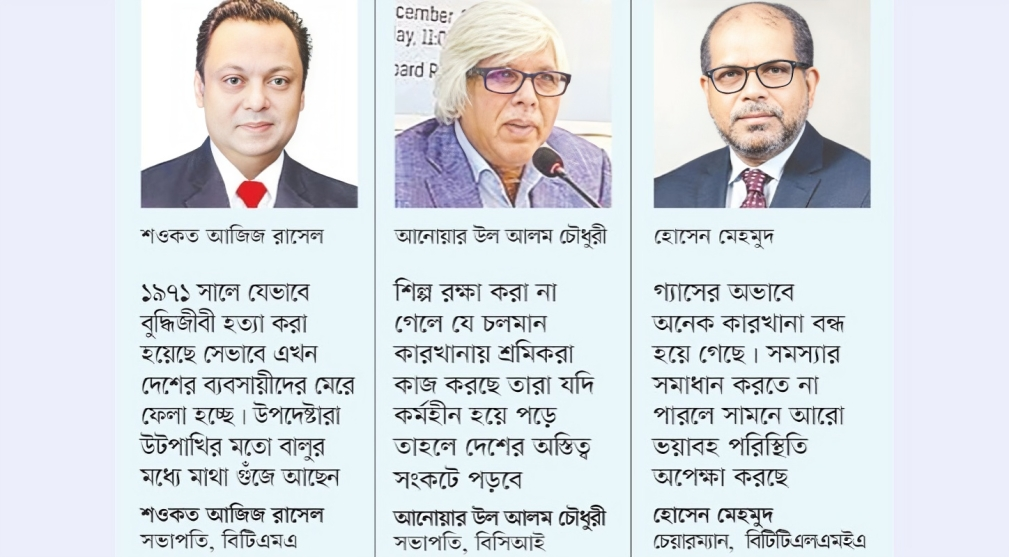 বিটিএমএ সভাপতি শওকত আজিজ বলেন, ১৯৭১ সালে বুদ্ধিজীবীদের খুঁজে খুঁজে হত্যা করা হয়েছে। আর ২০২৫ সালে শুধু শিল্প নয়, শিল্পোদ্যোক্তাদের মেরে ফেলা হচ্ছে। শিল্পে গ্যাস নেই, একের পর এক কারখানা বন্ধ হচ্ছে। আট মাসে এক টাকার বিনিয়োগও আসেনি , শিল্প বাঁচাতে না পারলে দেশে দুর্ভিক্ষ হবে । কিন্তু উপদেষ্টারা মনে হয় উটপাখির মতো বালুর মধ্য মাথা গুঁজে আছেন, কিছুই দেখতে পাচ্ছেন না। এটাকে আমরা ষড়যন্ত্র বলে মনে করি।