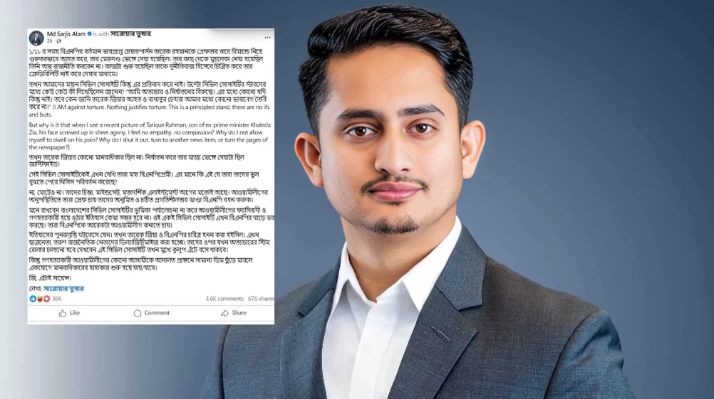 পোস্টে সারজিস আলম মনে করিয়ে দেন, ১/১১-এর সময় বিএনপির বর্তমান ভারপ্রাপ্ত চেয়ারপারসন তারেক রহমানকে গ্রেপ্তার করে রিমান্ডে নিয়ে নির্যাতন চালানো হয়। গুরুতর আহত অবস্থায় তার মেরুদণ্ড ক্ষতিগ্রস্ত হয় এবং তাকে মুচলেকা দিয়ে রাজনীতি থেকে সরে দাঁড়াতে বাধ্য করা হয়েছিল।