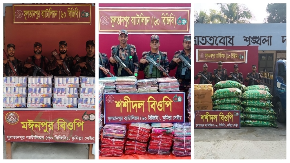 বিজিবি-৬০ ব্যাটালিয়নের অধিনায়ক লে. কর্নেল মো. জিয়াউর রহমান সোমবার দুপুরে গণমাধ্যমে পাঠানো এক প্রেস বিজ্ঞপ্তিতে এ তথ্য নিশ্চিত করেন। তিনি জানান, ব্রাহ্মণবাড়িয়ার কসবা ও আখাউড়া এবং কুমিল্লার ব্রাহ্মণপাড়া, বুড়িচং ও আদর্শ সদর উপজেলার সীমান্ত এলাকায় ধারাবাহিকভাবে অভিযান চালানো হয়। বিজিবির টহল দল উপস্থিত হওয়ায় চোরাকারবারীরা মালপত্র ফেলে পালিয়ে যায়।