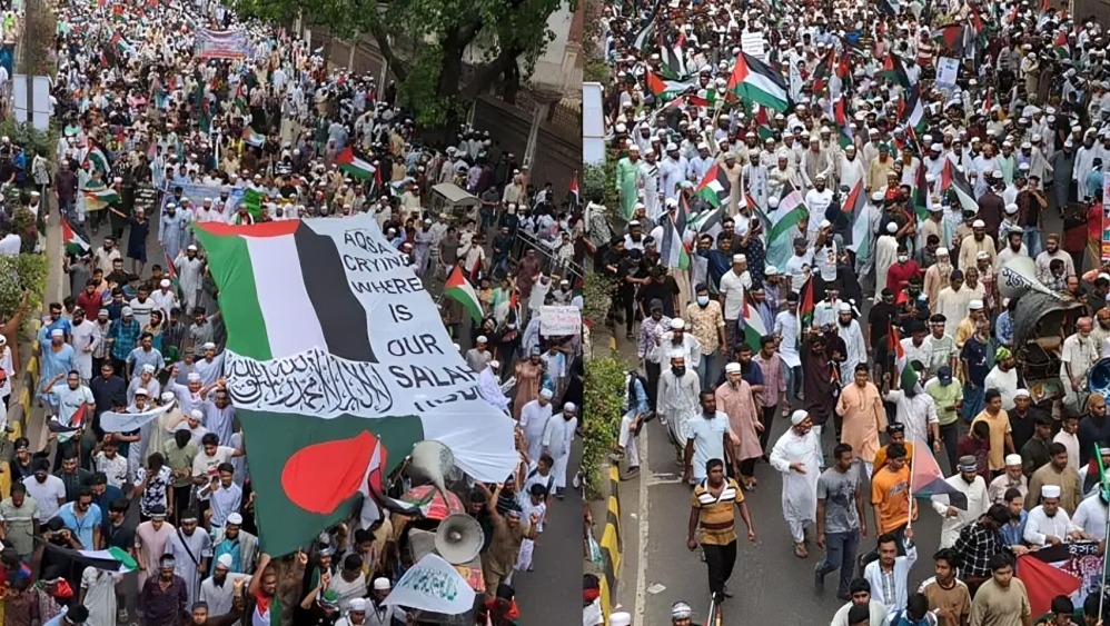 ভেদাভেদ ভুলে এক কাতারে দাঁড়ান দেশের অধিকাংশ রাজনৈতিক দলের নেতাকর্মীরা। ‘মার্চ ফর গাজা’ কর্মসূচি। গাজায় ইসরাইলি দখলদার বাহিনীর বর্বরোচিত হামলার প্রতিবাদ ও আগ্রাসনের বিরুদ্ধে ‘প্যালেস্টাইন সলিডারিটি মুভমেন্ট’ বাংলাদেশের আয়োজনে রাজধানীর সোহরাওয়ার্দী উদ্যানে শনিবার এ কর্মসূচি ঘিরে সকাল থেকে দেশের বিভিন্ন স্থান থেকে আসা লাখো মানুষের ঢল নামে। স্লোগানে স্লোগানে প্রকম্পিত হয়ে ওঠে ঢাকার রাজপথ। অধিকাংশ এলাকায় যানবাহন চলাচল বন্ধ হয়ে যায়।