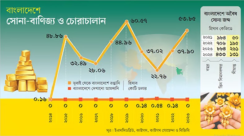 দুবাই থেকে বাংলাদেশে প্রতি বছর বিপুল পরিমাণ সোনা রপ্তানি হলেও সরকারি পরিসংখ্যান অনুযায়ী, সেই পরিমাণ খুবই সামান্য। কিন্তু জাতিসংঘের পশ্চিম এশিয়াবিষয়ক অর্থনৈতিক ও সামাজিক কমিশনের (ইএসসিডব্লিউএ) তথ্য অনুযায়ী, গত ১০ বছরে সংযুক্ত আরব আমিরাত থেকে বাংলাদেশে ৩৬৬ কোটি ৬৪ লাখ ডলারের সোনা রপ্তানি হয়েছে, যা বাংলাদেশি মুদ্রায় প্রায় ৩২ হাজার কোটি টাকা।