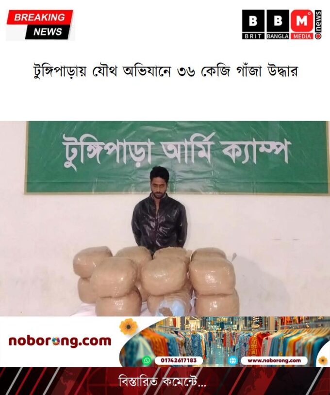 ByDesk ReportJanuary 28, 2026গোপালগঞ্জের টুঙ্গিপাড়া উপজেলায় সেনাবাহিনী ও পুলিশের যৌথ অভিযানে ৩৬ কেজি ৬০০ গ্রাম গাঁজাসহ এক ব্যক্তিকে আটক করা হয়েছে। মঙ্গলবার (২৭ জানুয়ারি ২০২৬) সন্ধ্যা...